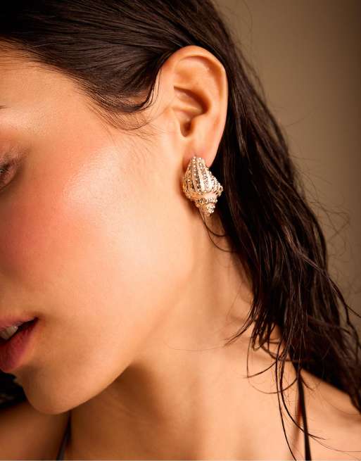 Stradivarius – Muschel-Creolen in Ecru mit Strassverzierung