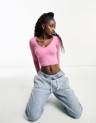Stradivarius – Nahtloses, geripptes Oberteil in Rosa mit V-Ausschnitt