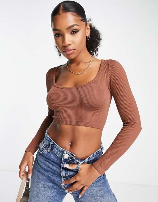 Stradivarius – Nahtloses, geripptes Oberteil in Schokobraun mit U-Ausschnitt