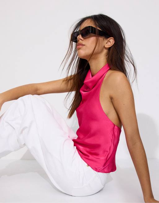 Stradivarius – Neckholder-Oberteil in leuchtend pinker Satinoptik