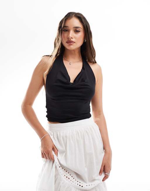 Stradivarius – Neckholder-Oberteil in Schwarz mit Wasserfall-Dekolleté