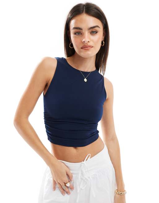 Stradivarius – Oberteil in Marineblau mit U-Boot-Ausschnitt und Raffung