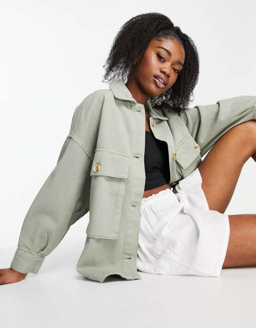 Stradivarius – Oversize-Cargojacke aus Twill in verwaschenem Khaki