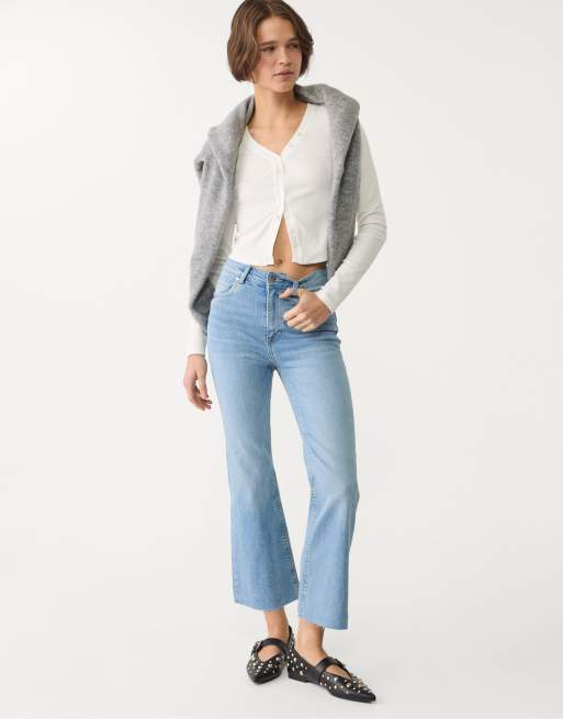 Stradivarius Petite – D78 – Ausgestellte Cropped-Jeans in Hellblau
