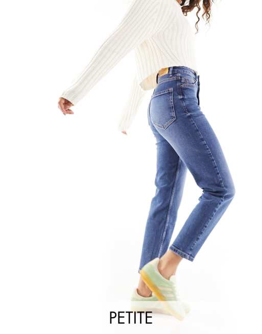 Stradivarius Petite – Schmal geschnittene Mom-Jeans mit Stretchanteil in authentischem Blau