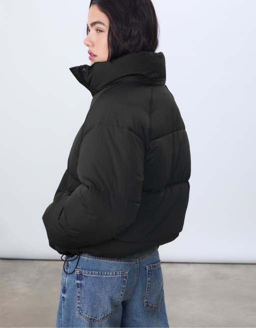 Stradivarius – Pufferjacke in Schwarz mit Kapuze