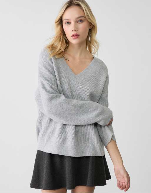 Stradivarius – Pullover aus gefilzter Baumwolle in meliertem Grau mit V-Ausschnitt