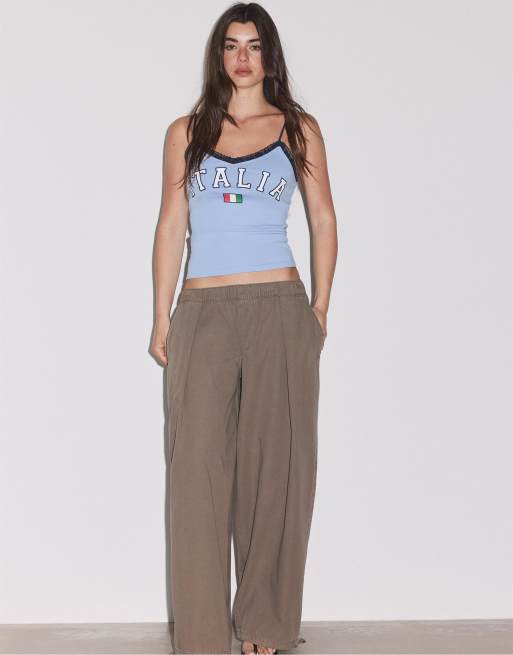 Stradivarius – Riemchenoberteil in Blau mit Print und Spitzenborte