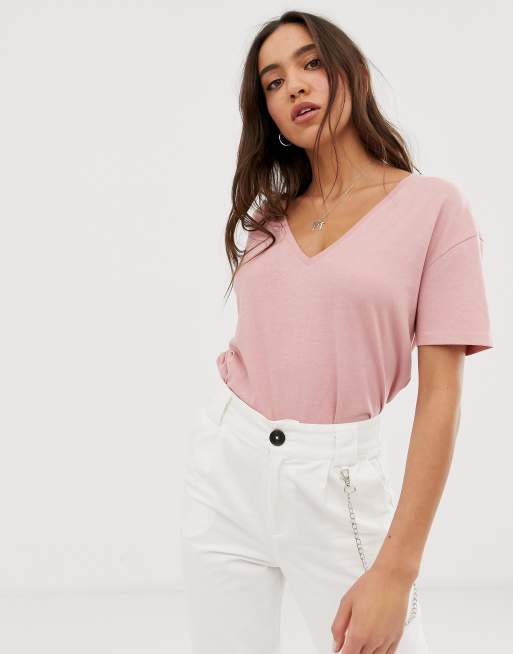 Stradivarius – Rosa T-Shirt mit V-Ausschnitt