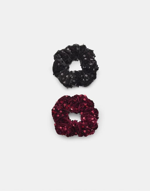 Stradivarius – Set mit 2 Scrunchie-Haargummis aus Samt in Schwarz mit Paillettenbesatz