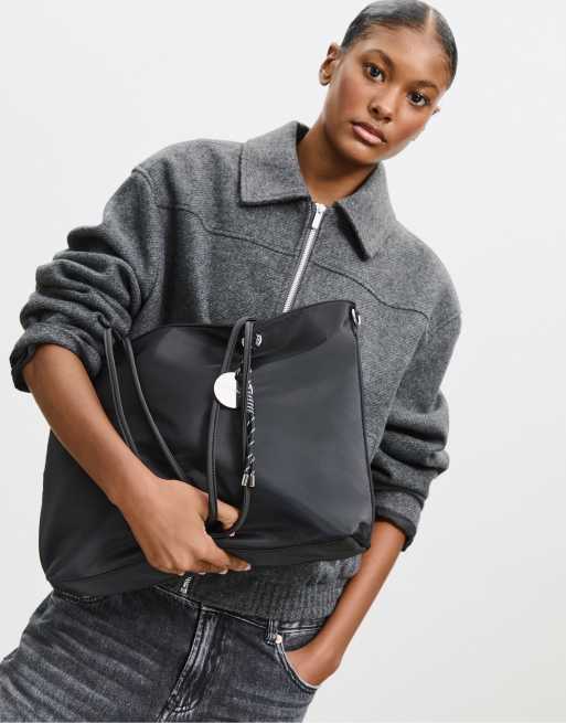 Stradivarius – Shopper-Tasche aus Stoff in Schwarz mit Taschenanhänger