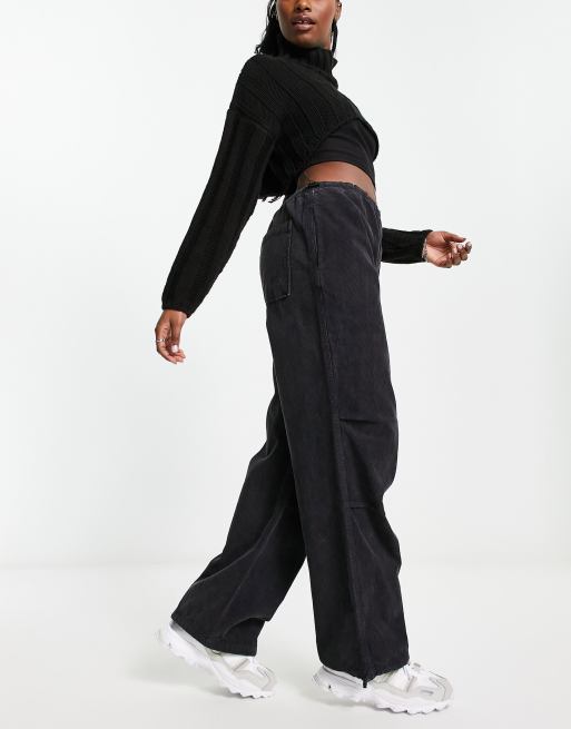 Stradivarius – STR – Fallschirmhose aus schwarzem Feincord mit Oversize-Schnitt