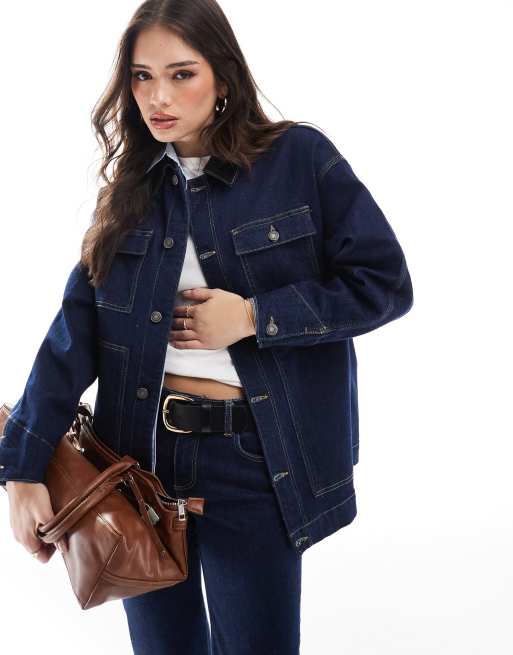 Stradivarius – STR – Jeansjacke in Indigoblau mit Cord-Detail, Kombiteil