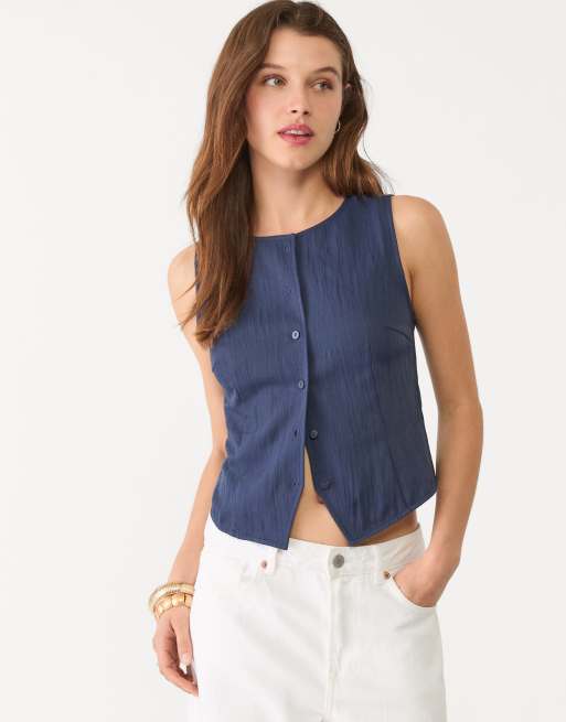 Stradivarius – Strukturiertes Oberteil in Marineblau mit Knöpfen