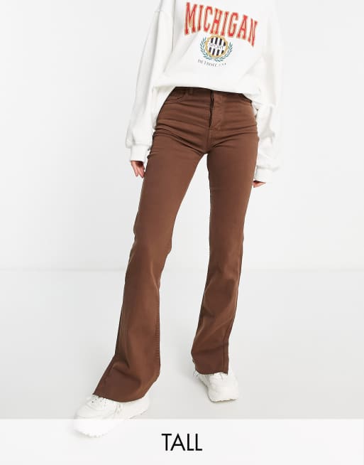 Stradivarius Tall – Schmal geschnittene, ausgestellte Jeans in Braun mit Schlitz am Saum