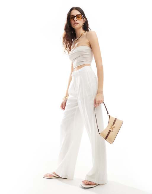Stradivarius – Trägerloses, geripptes Oberteil in Beige mit umgeschlagenem Ausschnitt