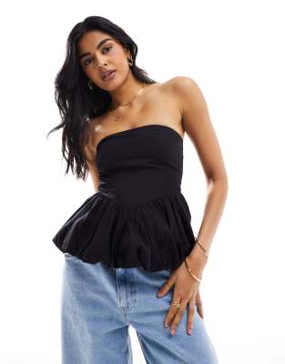 Stradivarius – Trägerloses Oberteil in Schwarz mit Schößchensaum