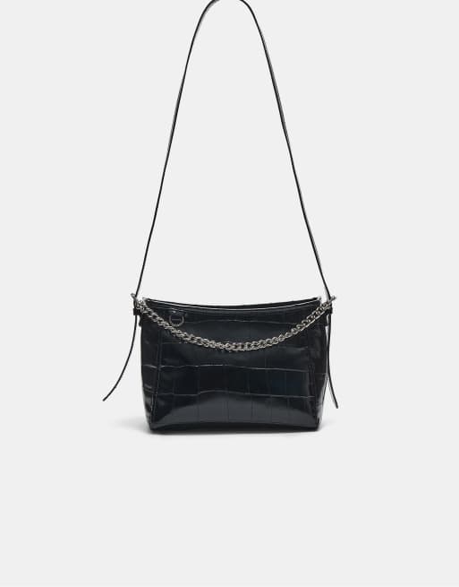 Stradivarius – Umhängetasche in Kroko-Schwarz mit Kettendetail