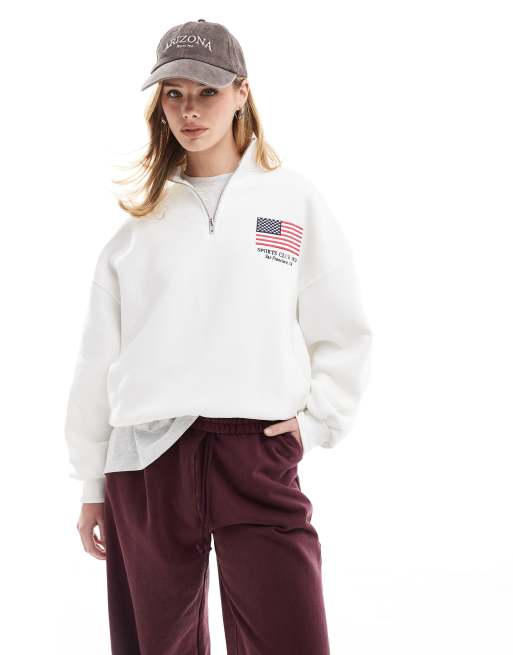 Stradivarius – USA – Sweatshirt in Ecru mit kurzem Reißverschluss