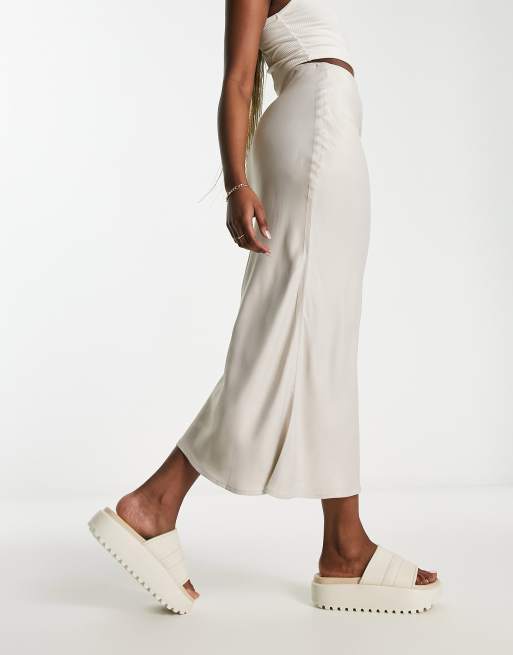 Stradivarius – Wadenlanger Rock aus Satin in Champagner