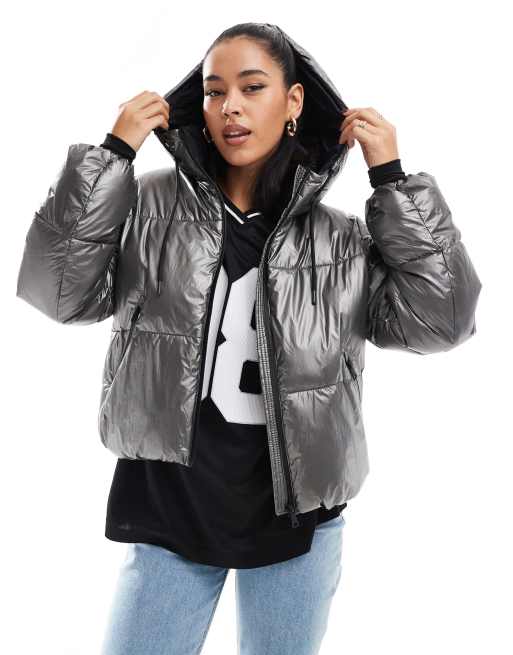Stradivarius – Wattierte Jacke in Metallic-Grau mit Kapuze