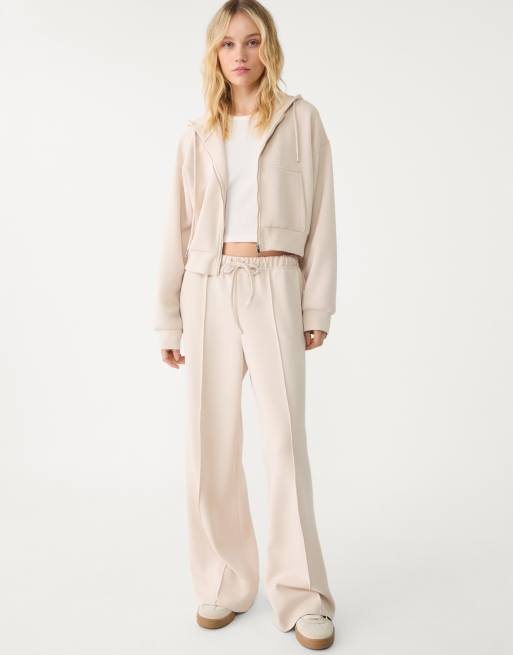 Stradivarius – Weiche Hose in Steinbeige mit weitem Bein und Ziernaht