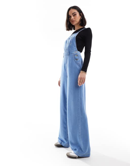Stradivarius – Weicher Denim-Jumpsuit in Hellblau mit überkreuzten Rückenträgern
