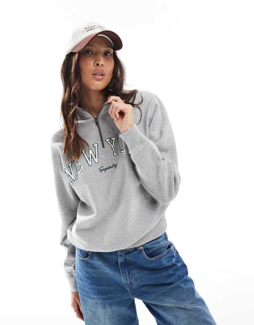 Superdry – Athletic Essentials – Sweatshirt in meliertem Grau mit kurzem Reißverschluss und Applikation