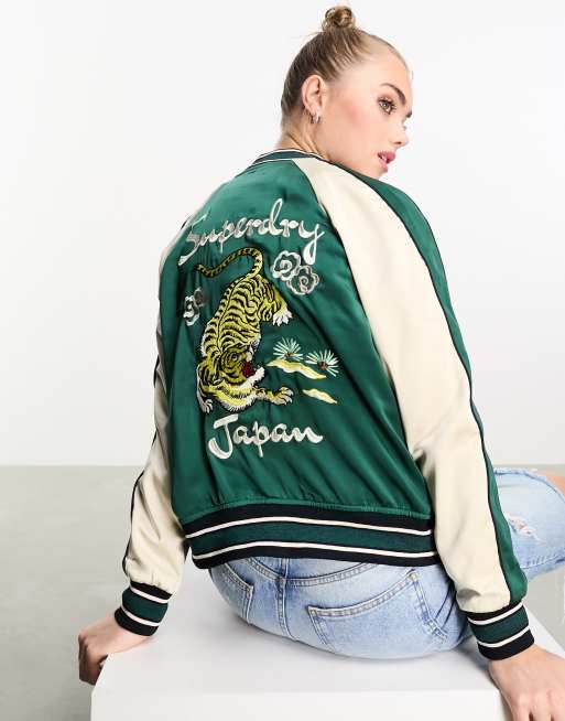Superdry – Bestickte Sukajan-Bomberjacke in Piniengrün