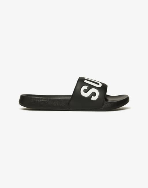 Superdry – Core – Pool-Slider in Schwarz/optischem Weiß mit Print