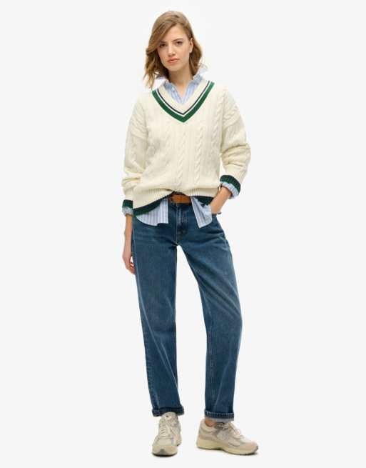 Superdry – Cricket-Strickpullover in Wollweiß mit V-Ausschnitt und Oversize-Schnitt