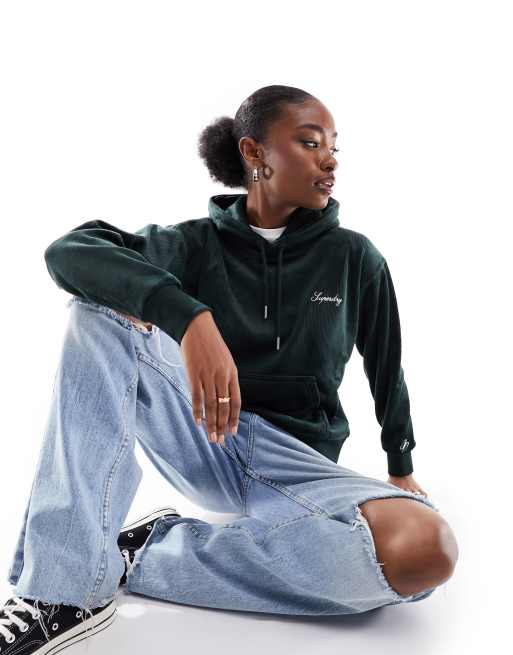 Superdry – Drop Needle – Kastiger Kapuzenpullover aus Velours in dunklem Akademie-Grün