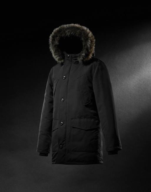Superdry – Everest – Parka in Tiefschwarz mit Kapuze mit Kunstpelzbesatz