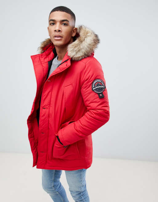 Superdry – Everest – Rote Parka mit Kapuze und Kunstpelzbesatz