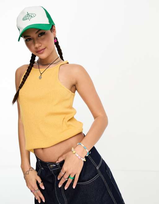 Superdry – Geripptes Camisole-Oberteil in Gelb mit Spitzenbesatz