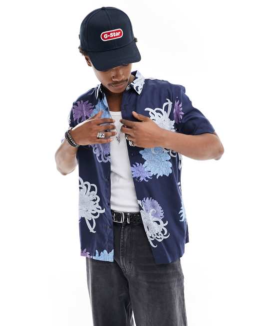 Superdry – Hawaiihemd in Marineblau mit Chrysanthemen-Muster