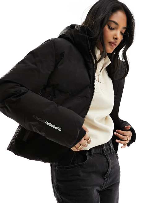 Superdry – Kastige Steppjacke in Schwarz mit Kapuze