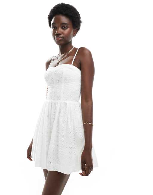 Superdry – Kurzes Trägerkleid in Weiß mit Lochstickerei