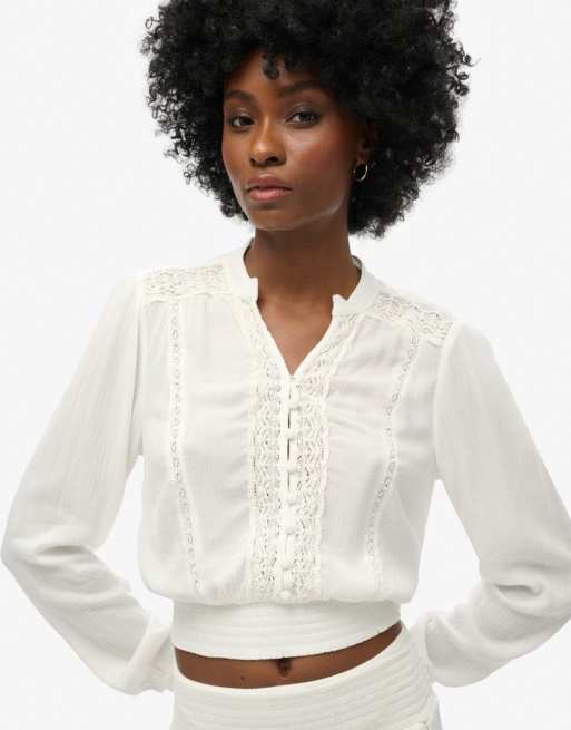 Superdry – Langärmlige, gesmokte Bluse in Ecru mit Spitzenbesatz