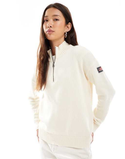 Superdry – Lässig geschnittener Pullover aus Strick in Naturweiß mit kurzem Reißverschluss