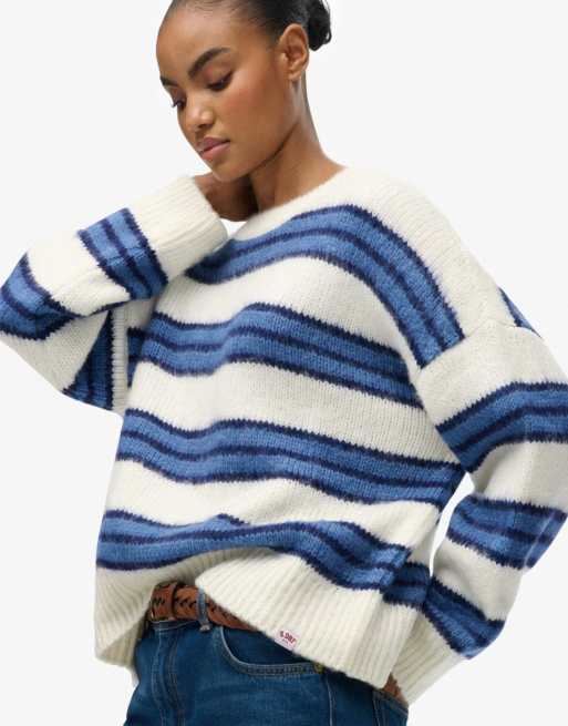 Superdry – Lässiger, angerauter Strickpullover in gebleichtem Jeansblau mit Streifen