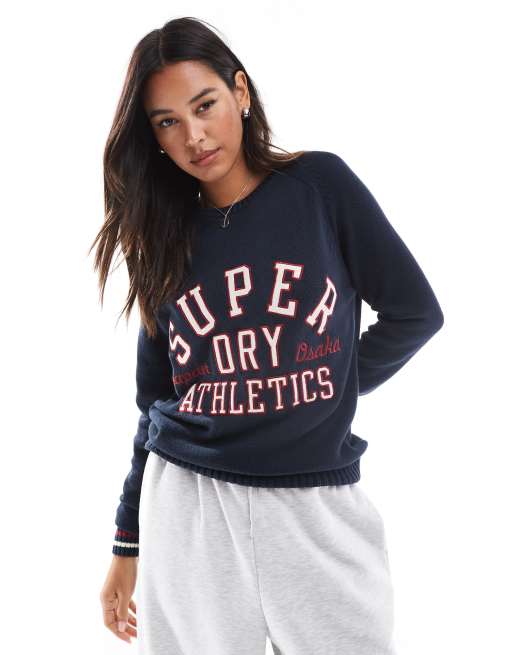 Superdry – Lockerer Strickpullover in kräftigem Marineblau mit Rundhalsausschnitt und Print
