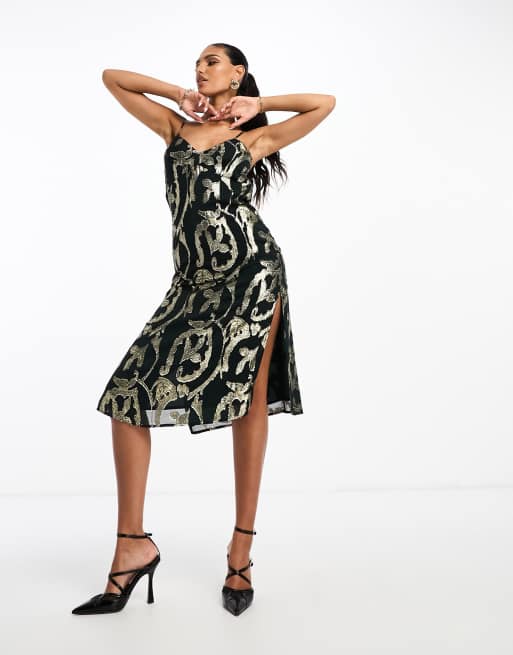 Superdry – Midi-Trägerkleid in Dunkelgrün mit Metallic-Muster