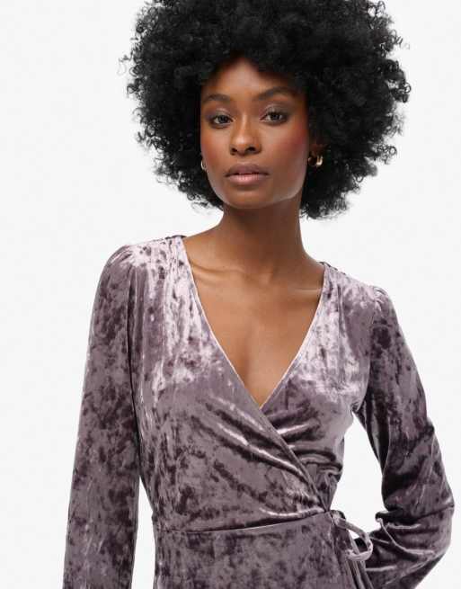 Superdry – Mini-Wickelkleid aus Samt in dunklem Felsengrau
