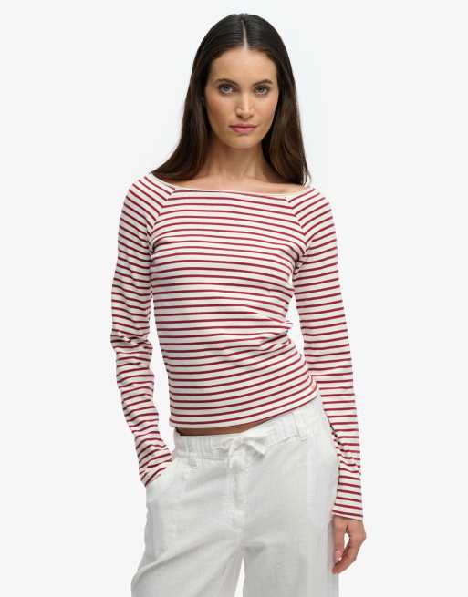 Superdry – Schulterfreies, gestreiftes Oberteil in Bordeauxrot mit Carmen-Ausschnitt