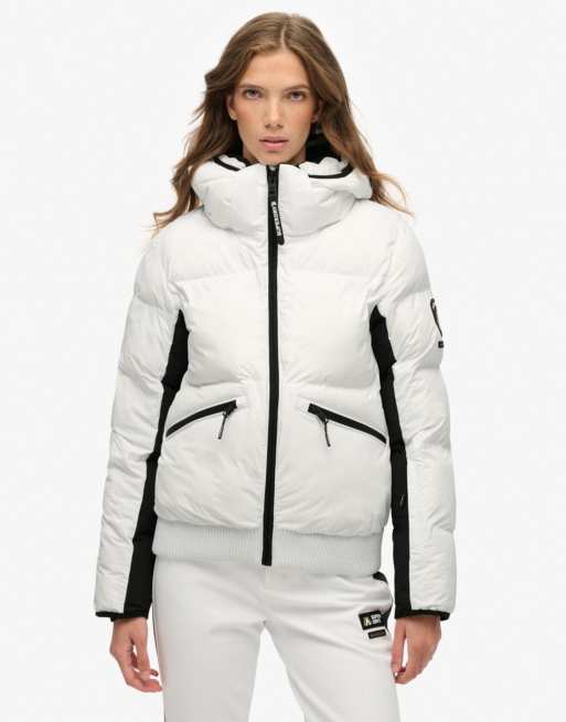 Superdry – Ski-Bomberjacke in optischem Weiß mit Kapuze