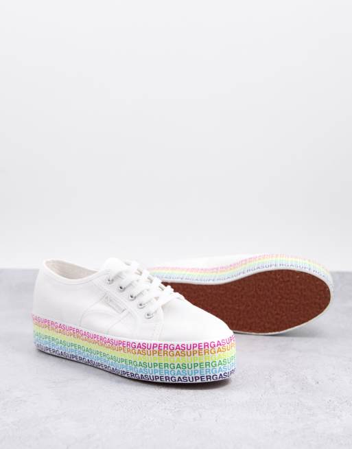 Superga – 2790 – Sneaker in Weiß mit flacher Plateausohle und Regenbogen-Logo