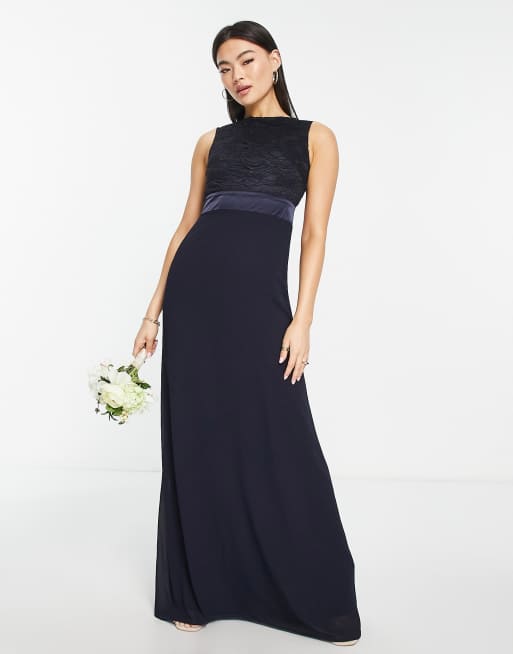 TFNC – Bridesmaids – Langes Brautjungfernkleid aus Chiffon in Marineblau mit Rückseite aus Spitze mit Bogenkante