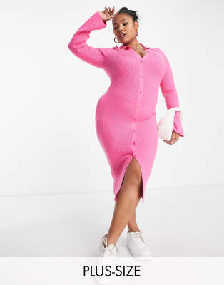 The Frolic Plus – Midaxi-Kleid mit Knopfleiste und Trompetenärmeln in leuchtendem Rosa