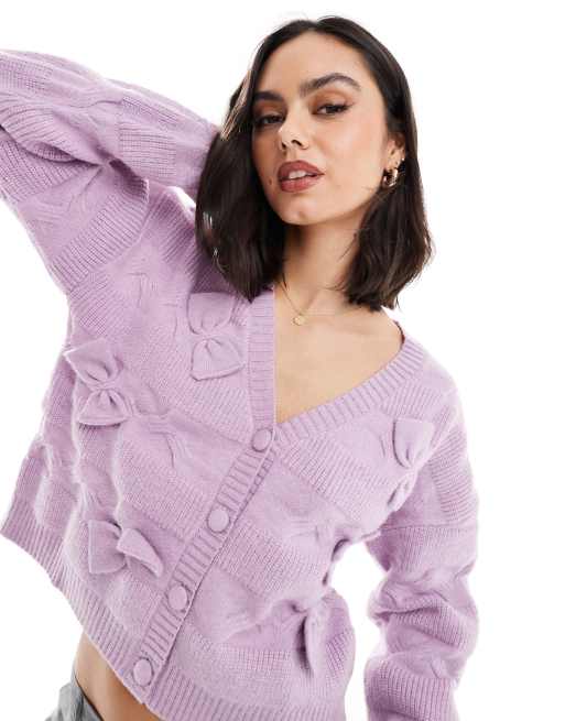 The Frolic Exklusiv – Strickjacke in Flieder mit Zopfmuster, Knopfleiste und Schleifendetails